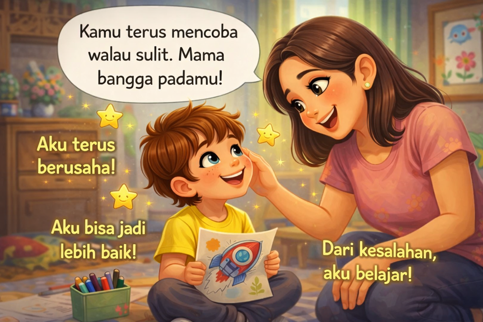 Oleh karena itu, penting bagi orang tua untuk lebih fokus pada proses daripada hasil. Kalimat sederhana seperti “Kamu sudah berusaha keras,” “Kamu tidak menyerah,” atau “Ayo kita coba lagi bersama” membantu anak memahami bahwa usaha adalah hal yang paling penting.