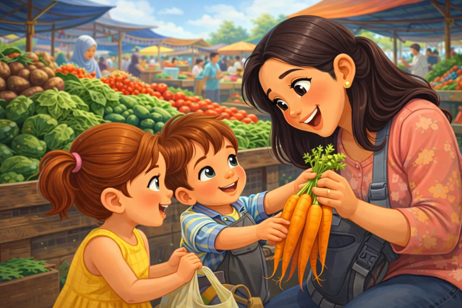 Momen sehari-hari seperti berbelanja bahan makanan menjadi pengalaman belajar yang berharga ketika orang tua berbicara, membimbing, dan melibatkan anak-anak mereka (Klik pada gambar untuk mendapatkan produk terkait)