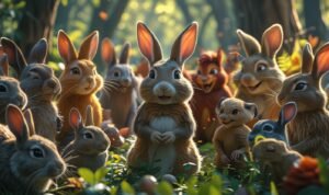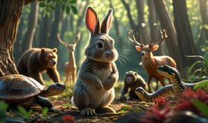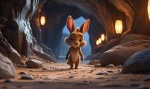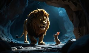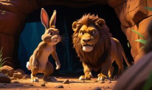 When it was the clever rabbit’s turn, he thought of a plan to save himself and the other animals. He walked slowly toward the lion’s cave, making sure to arrive late. The lion, growing impatient, roared in anger when he saw the rabbit.